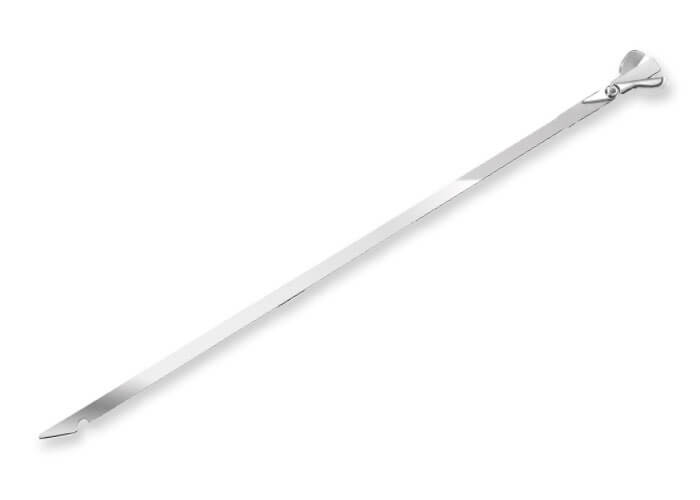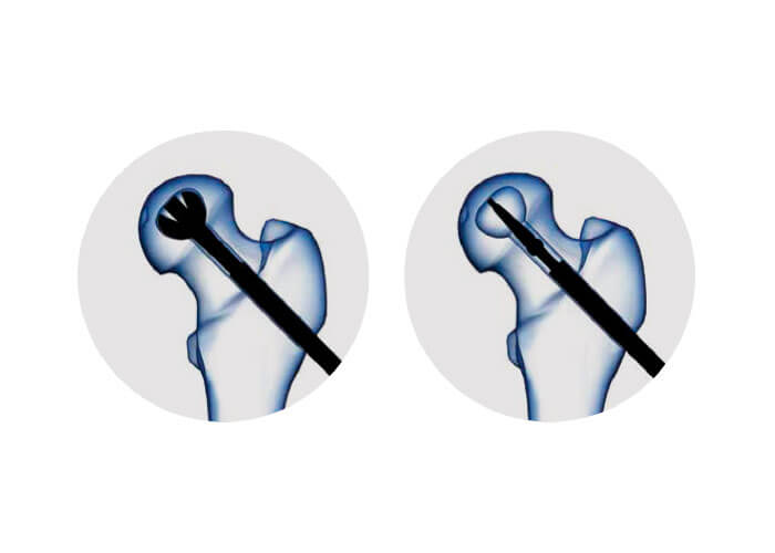 Lâmina para debridamento de necrose de cabeça femoral (descompressão). O sistema permite o debridamento do tecido necrosado, paulatinamente através de sua abertura de até 2,5 cm, e preparando o local para aplicação de substituto ósseo através de seu instrumental adequado.